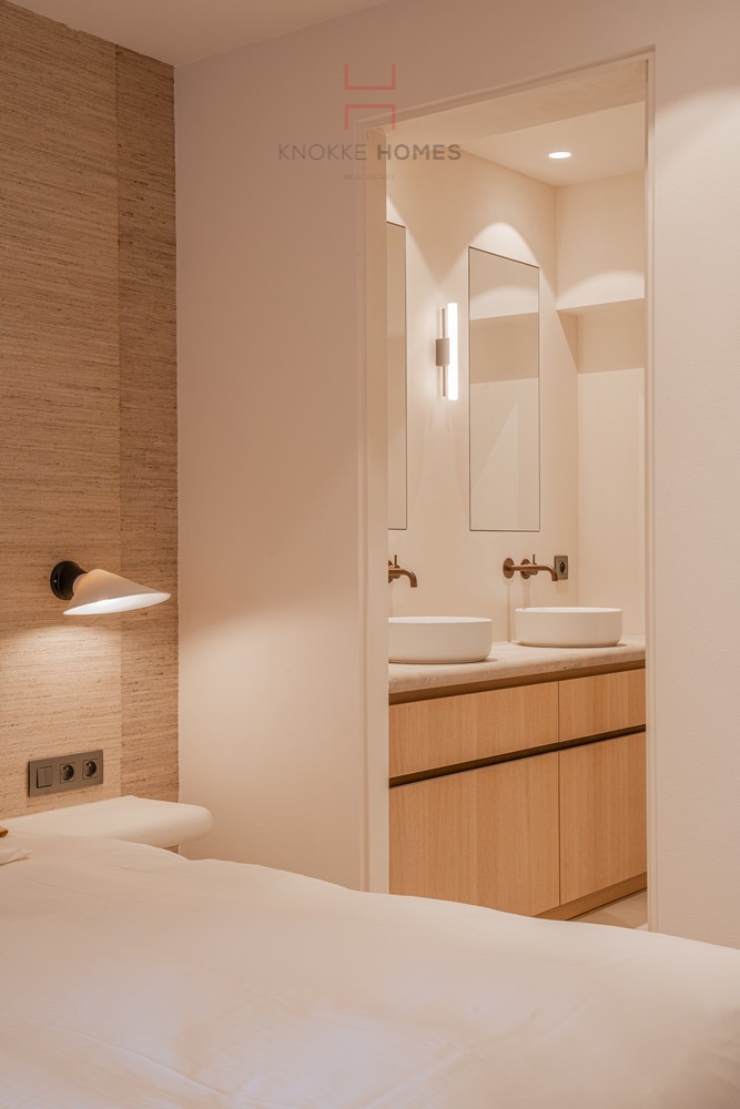 L'appartement dispose de trois chambres. La chambre principale est équipée d'armoires encastrées et d'une salle de bains attenante avec double lavabo, douche à l'italienne et toilettes. La deuxième chambre dispose également d'armoires sur mesure et d'une salle de douche privée avec lavabo. Les deux chambres donnent accès à une terrasse arrière calme. La troisième chambre a été aménagée de manière pratique avec un élégant lit superposé, idéal comme chambre d'enfant ou chambre d'amis.