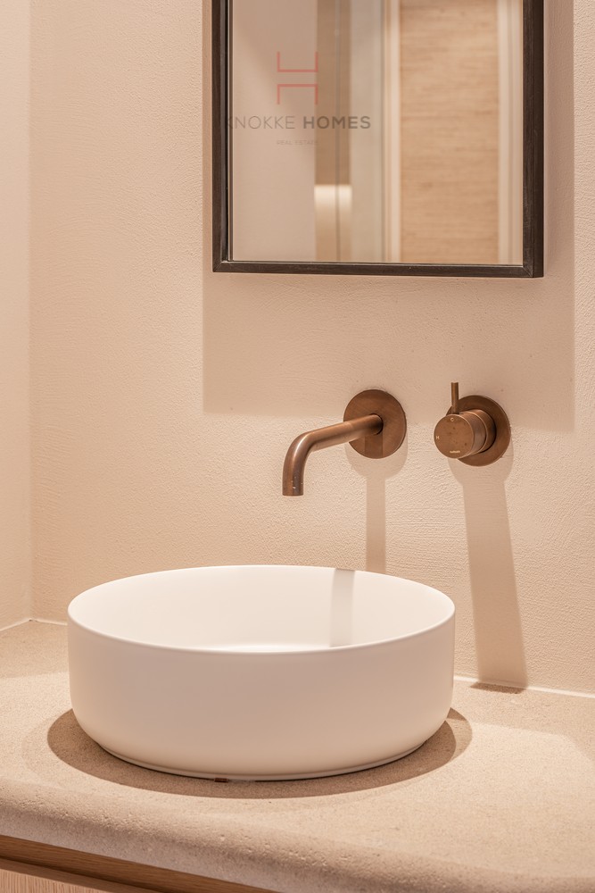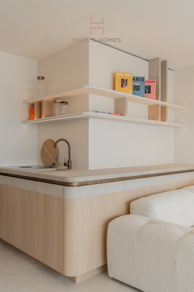 En entrant, vous êtes accueilli dans un hall d'entrée soigné avec des toilettes pour invités et un vestiaire pratique. Le salon spacieux et lumineux, avec son coin salon confortable, donne sur une agréable terrasse côté mer et offre une vue panoramique imprenable sur la mer. La cuisine ouverte est entièrement équipée et finie avec des matériaux de haute qualité et des appareils modernes, parfaite pour ceux qui aiment le confort et la convivialité.