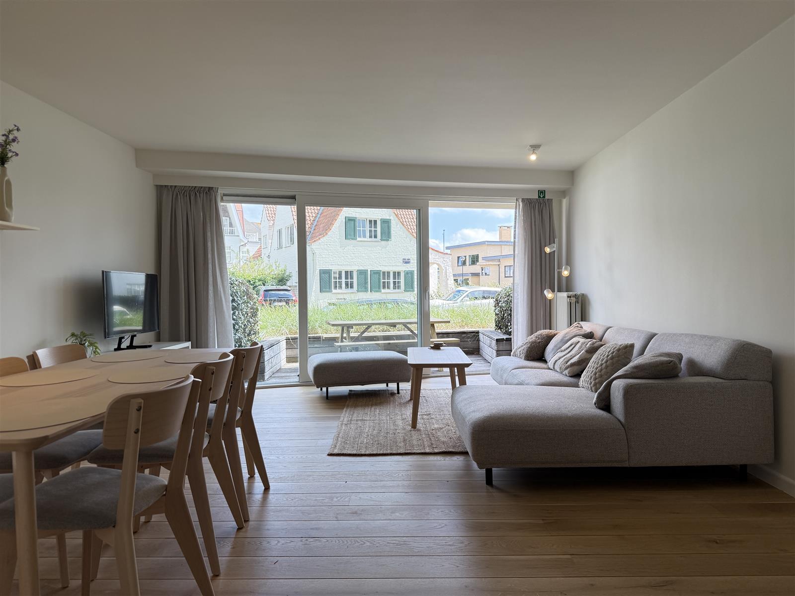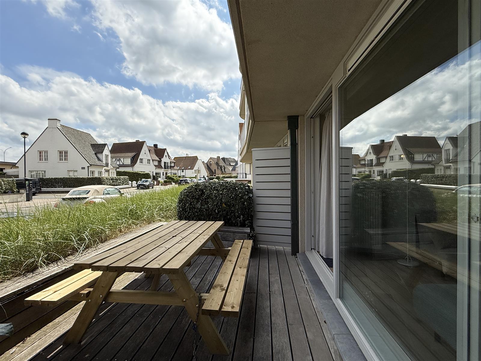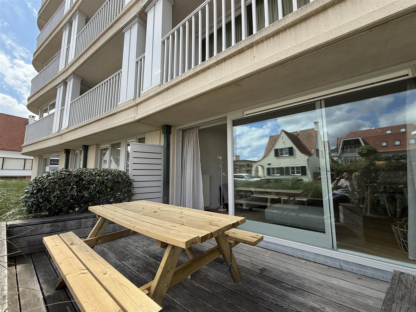 Gezellig gelijkvloersappartement met zuidgericht zonneterras de hoek om van de zeedijk te Duinbergen. Mogelijk om staanplaats in het gebouw bij te huren.