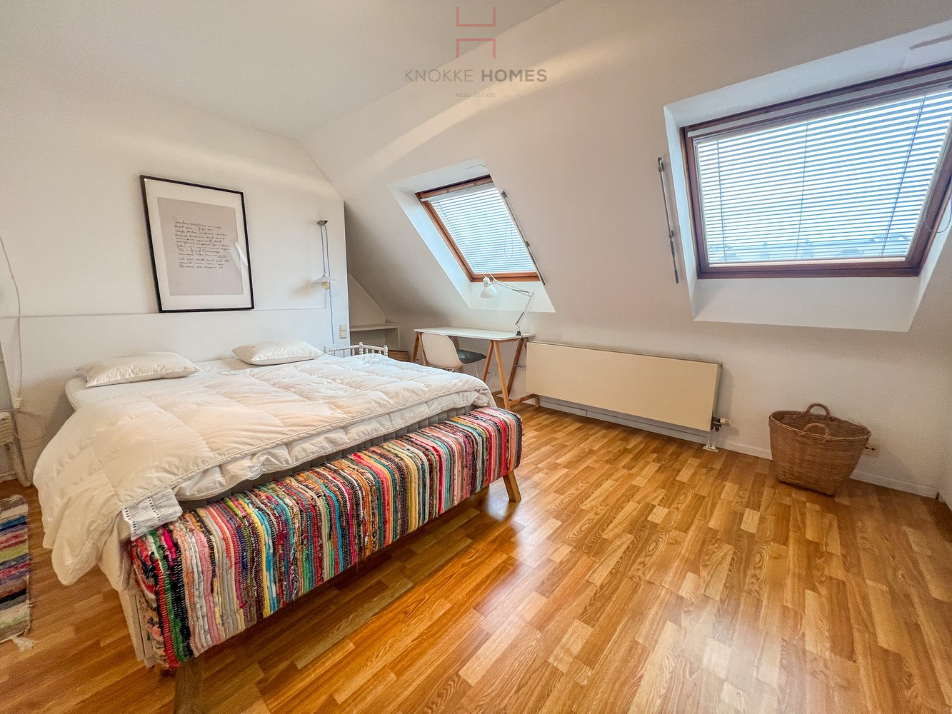 Ruim appartement op de vierde verdieping met een inkomhal voorzien van vestiairekast en gastentoilet. Via een schuifdeur kom je in de grote leef- en eetruimte die zich uitstrekt van voor- tot achtergevel en uitgeeft op twee mooie terrassen, waarvan één met een praktische terrasberging. De ingerichte semi-open keuken sluit aan op een handige berging met onder meer de CV-installatie en aansluiting voor wasmachine. Het appartement is uitgerust met videofonie en afgewerkt met een parkethouten vloer. Een open trap leidt naar verdieping 5, waar de nachthal toegang biedt tot twee slaapkamers. De eerste slaapkamer beschikt over een twijfelaar, een eenpersoonsbed en een lavabo op de kamer. De tweede, ruime slaapkamer is ingericht met een dubbel bed, ingemaakte kasten en een ensuite badkamer met ligbad, afzonderlijke douche, dubbele lavabo en toilet. Op de begane grond bevindt zich een garagebox (nr. 6) voor één wagen. Er zijn afzonderlijke tellers voor alle nutsvoorzieningen (overname bij intrede) en de gemeenschappelijke lasten zijn inbegrepen in de huurprijs.