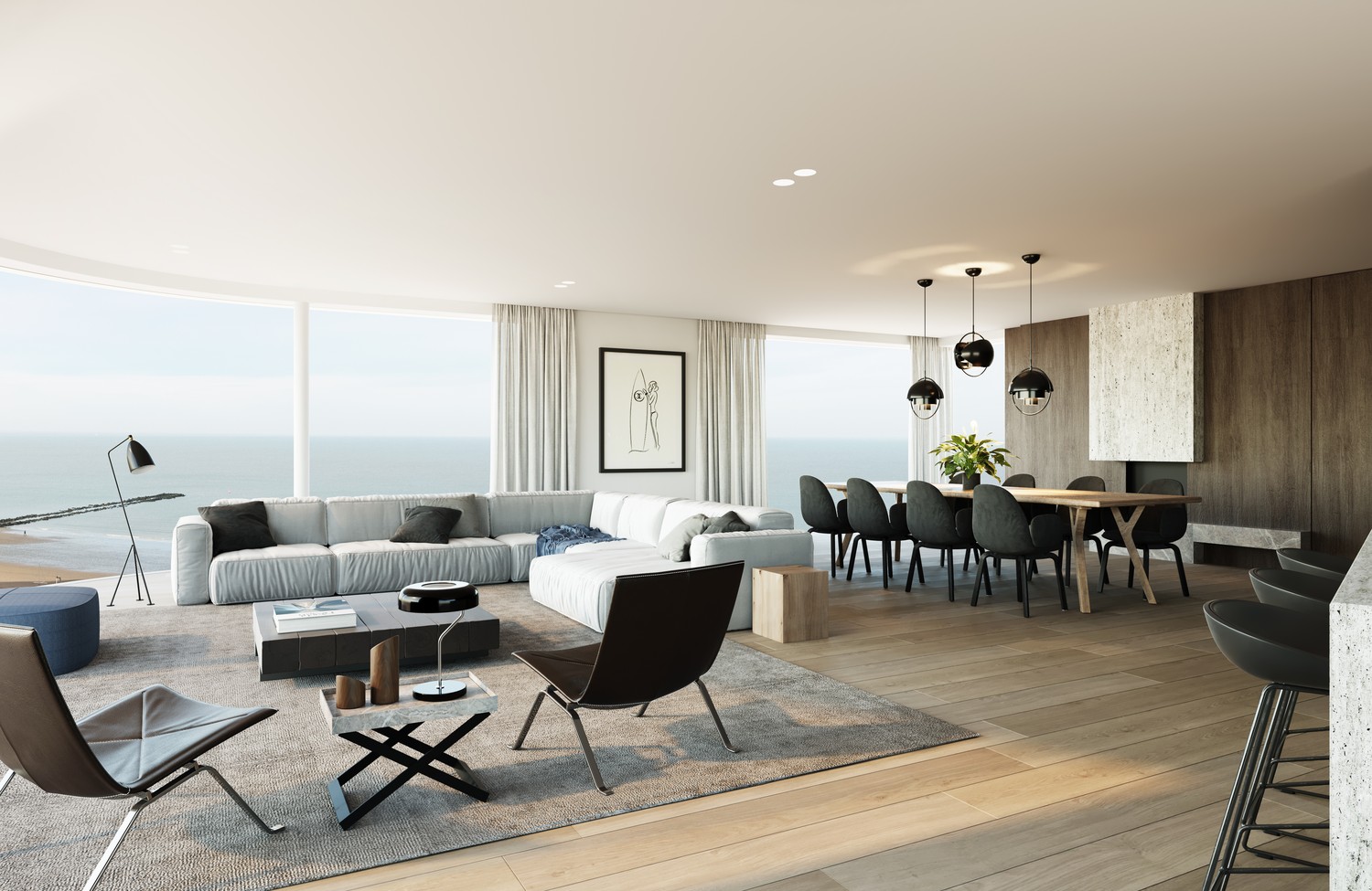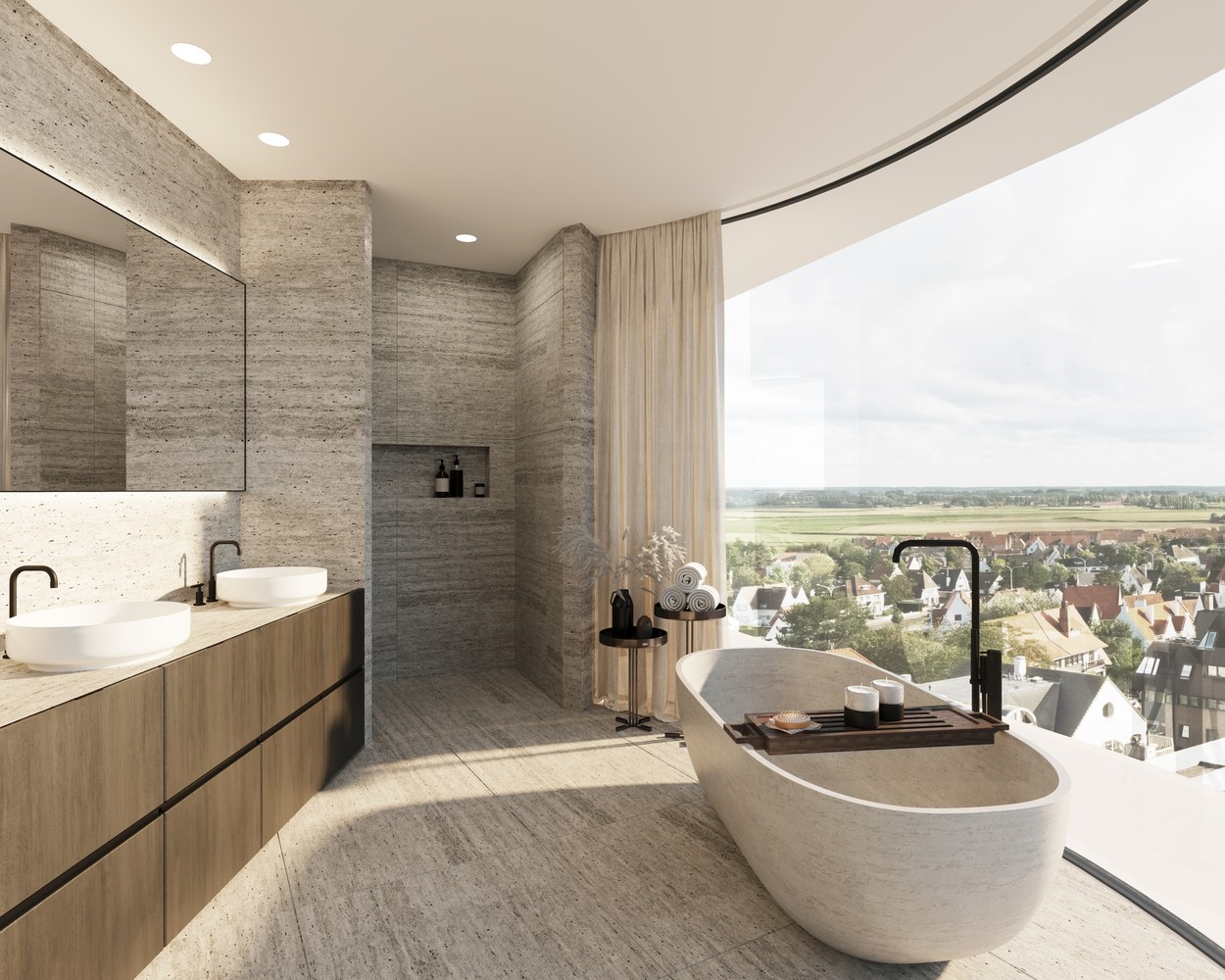 Indeling: Level 08: inkomhal met vestibule en gastentoilet. Natuursteen. Via dubbel deur betreedt men de enorme leefruimte met maar liefst ca. 11m brede ramen uitgevend op terras en de zee. Parkethouten vloeren. Kwalitatieve en exclusieve keukeninrichting met mogelijkheid tot kookeiland, compleet geëquipeerd volgens de wens van de klant. Binnentrap naar de bovenliggende verdieping. Praktische en ruime berging voor o.a. de technische installaties en aansluiting WM/DK. Achteraan, uitgevend op terras de eerste van de vier slaapkamers, met eigen privé badkamer voor o.a. ligbad, douche, dubbele lavabo en toilet. Via de private binnenlift of trap toegang tot level 09 (ook afzonderlijk bereikbaar via de gemeenschappelijke hall/lift). Op level 09 geniet u o.a. van 3 grote slaapkamers, elk voldoende groot voor dubbel bed: Slaapkamer 2 met vele ingemaakte kasten is vergezeld van een praktische bureelhoek en een eigen badkamer voor zowel douche, ligbad en een dubbele lavabo. Slaapkamer 3 geniet eveneens een eigen badkamer met douche en lavabo en een grote dressing-hoek. Slaapkamer 4 heeft dan weer haar eigen badkamer met privaat toilet, douche en lavabo. In de nachthall is nog een extra nachttoilet en veel kastruimte. Een uitzonderlijke wooneenheid waarin grote families en/of vele gasten op gepaste wijze kunnen verwend worden. 'One of a kind'...