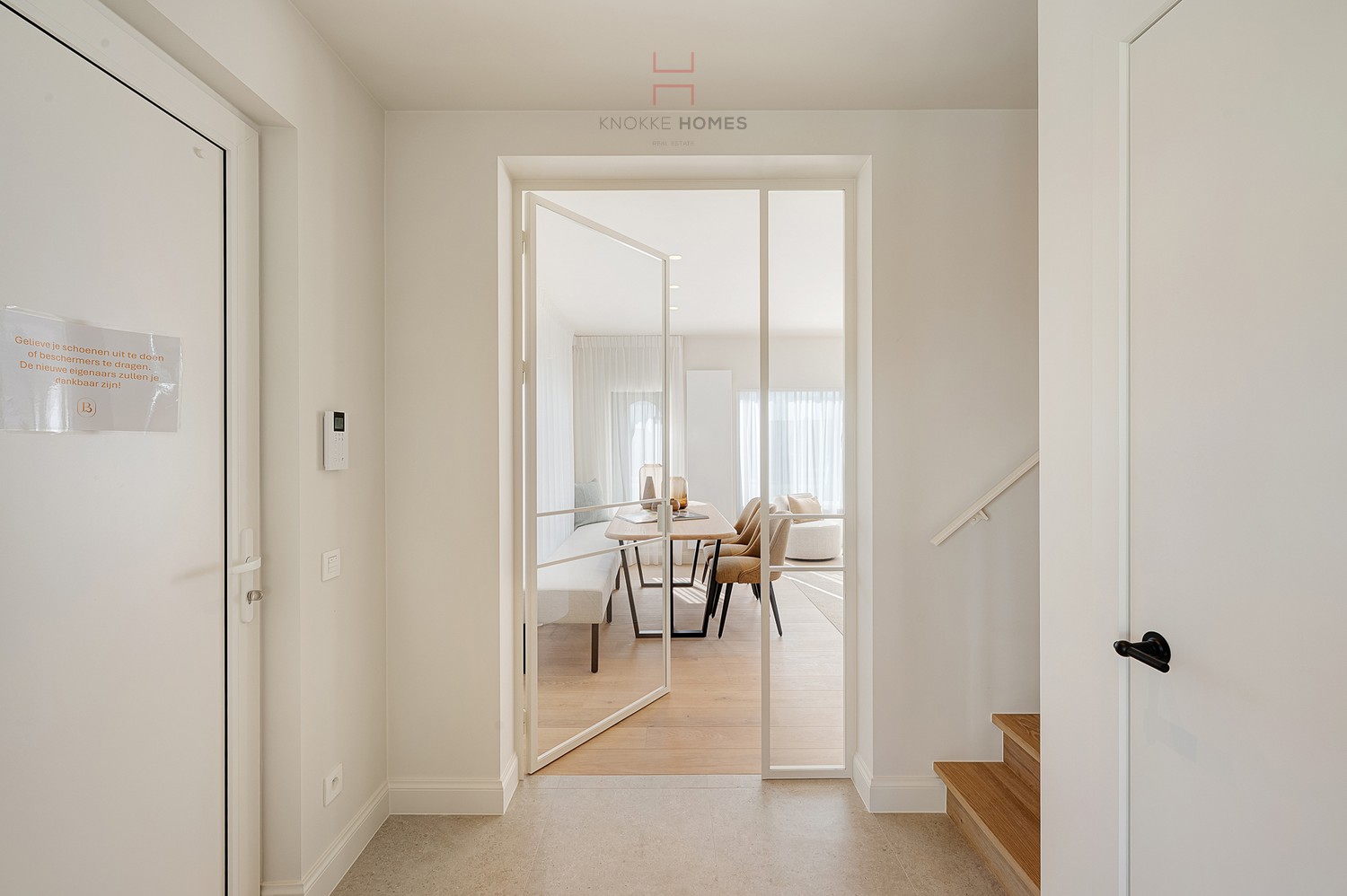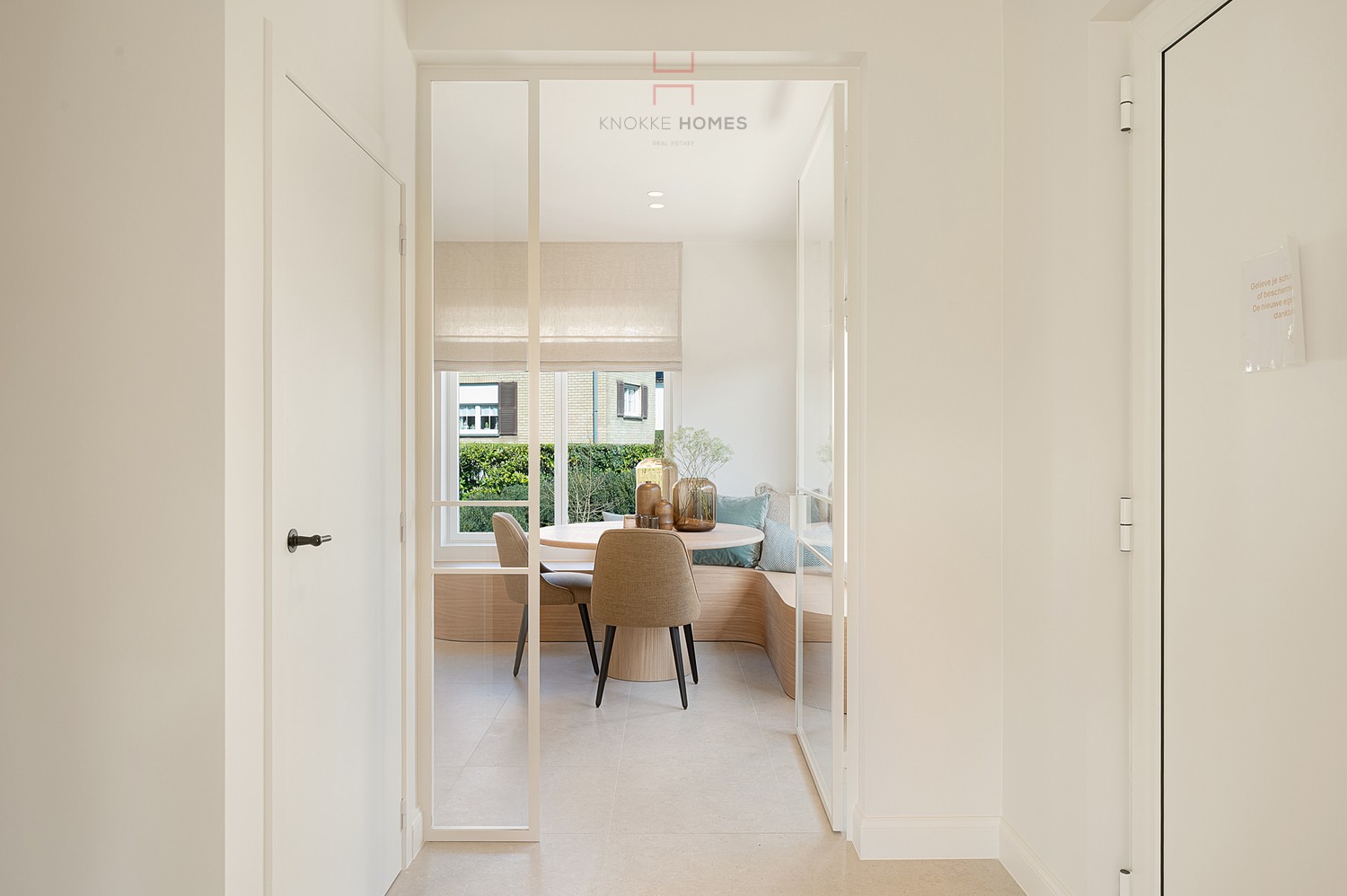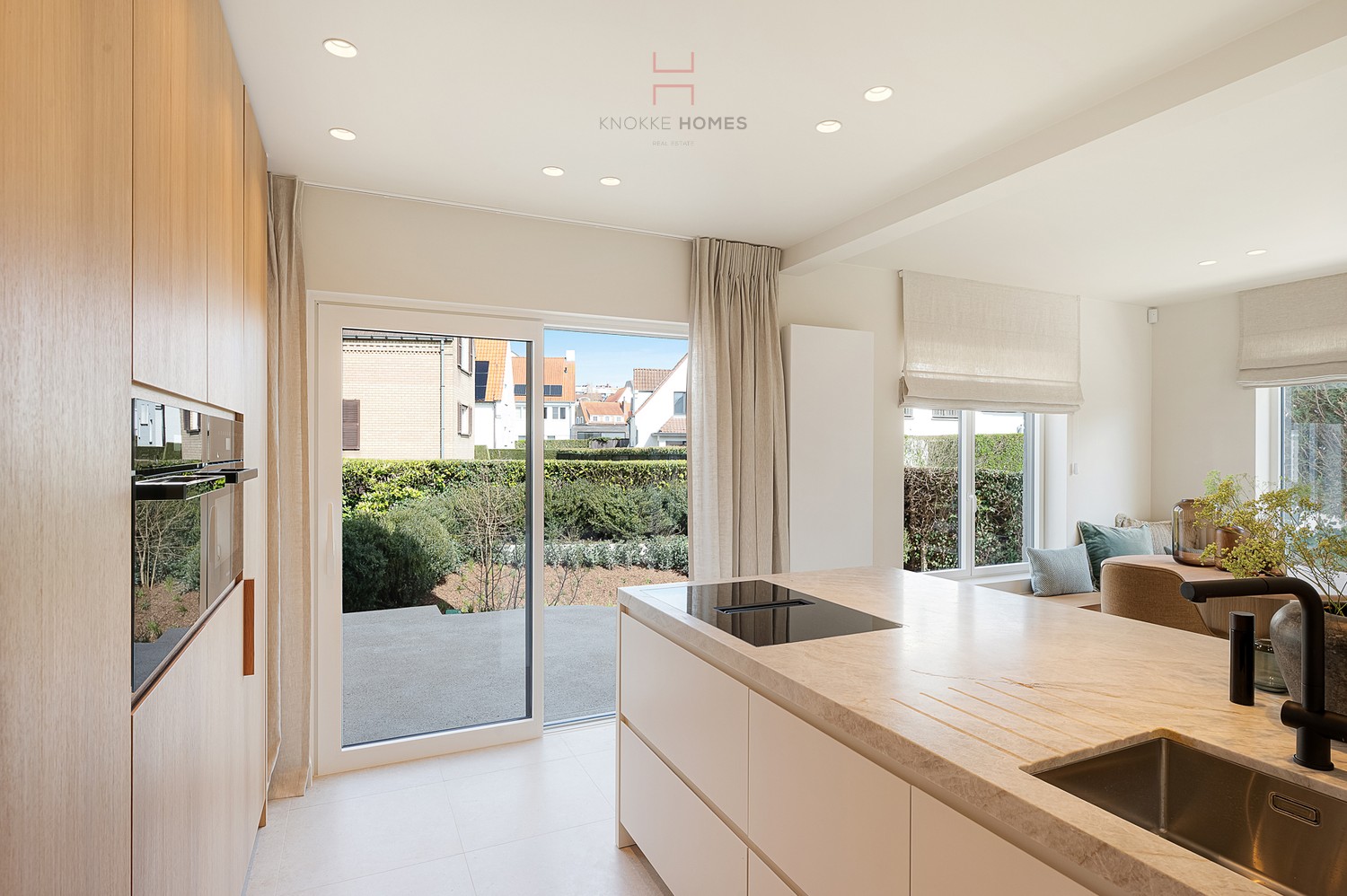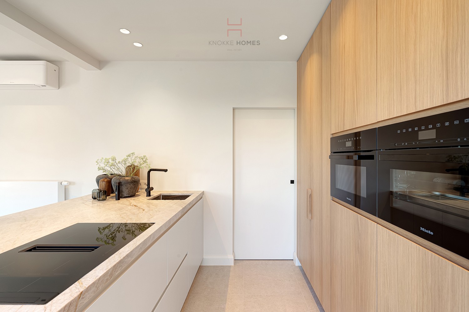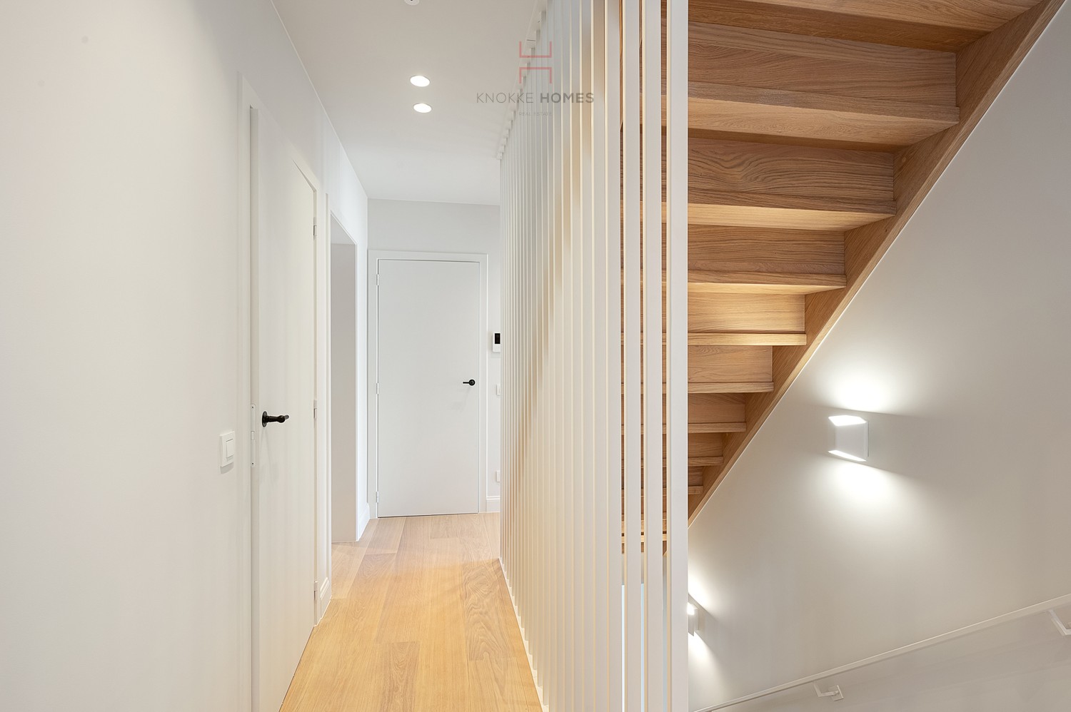 Via de stijlvolle inkomhal met gastentoilet betreedt men de gezellige lichtrijke leefruimte aan de voorzijde en de open keuken aan de tuinzijde. De zonnige woonkamer straalt warmte en elegantie uit en vormt het kloppend hart van de woning, terwijl de luxueuze keuken, afgewerkt in eiken fineer, een echte eyecatcher is. Deze is volledig uitgerust met kwalitatieve toestellen, en sluit naadloos aan op een gezellige eethoek met prachtig zicht op de tuin en het aangename terras.