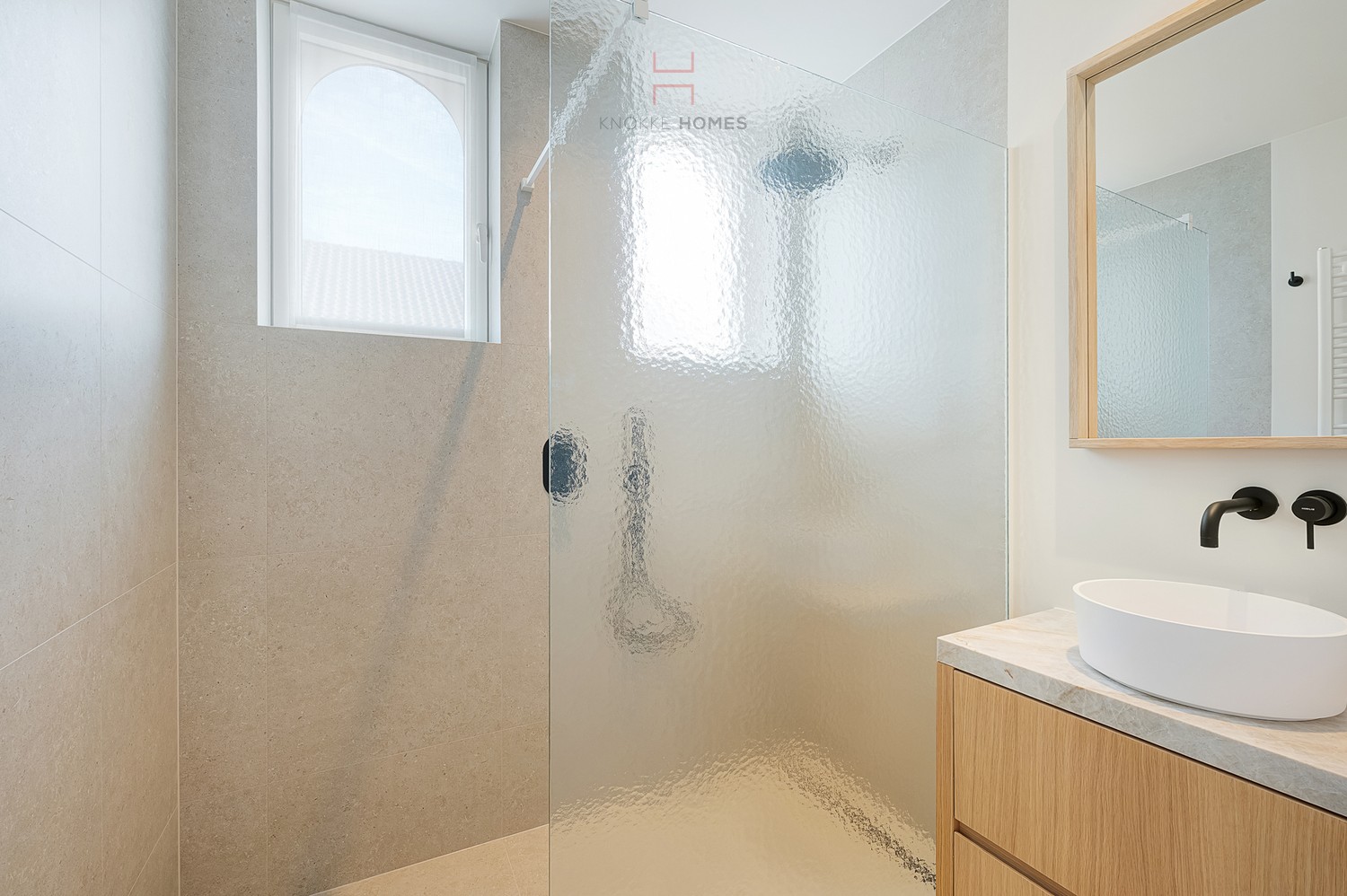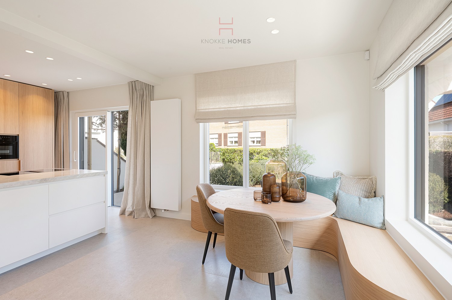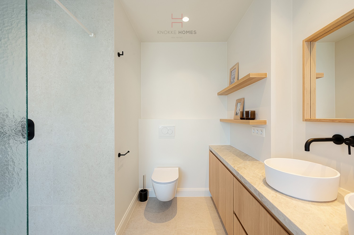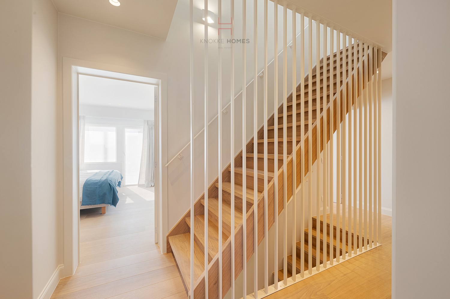 Via de stijlvolle inkomhal met gastentoilet betreedt men de gezellige lichtrijke leefruimte aan de voorzijde en de open keuken aan de tuinzijde. De zonnige woonkamer straalt warmte en elegantie uit en vormt het kloppend hart van de woning, terwijl de luxueuze keuken, afgewerkt in eiken fineer, een echte eyecatcher is. Deze is volledig uitgerust met kwalitatieve toestellen, en sluit naadloos aan op een gezellige eethoek met prachtig zicht op de tuin en het aangename terras.