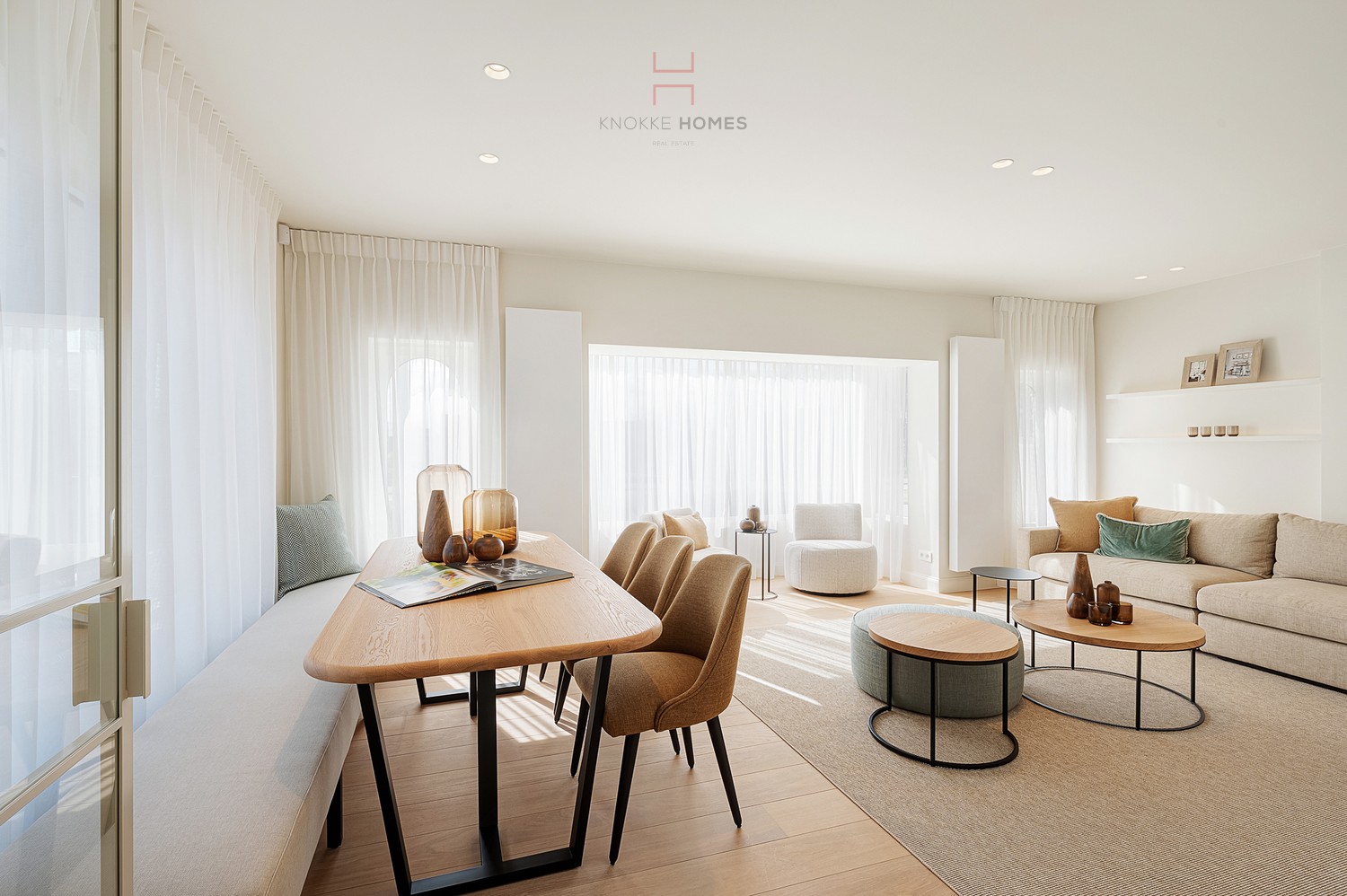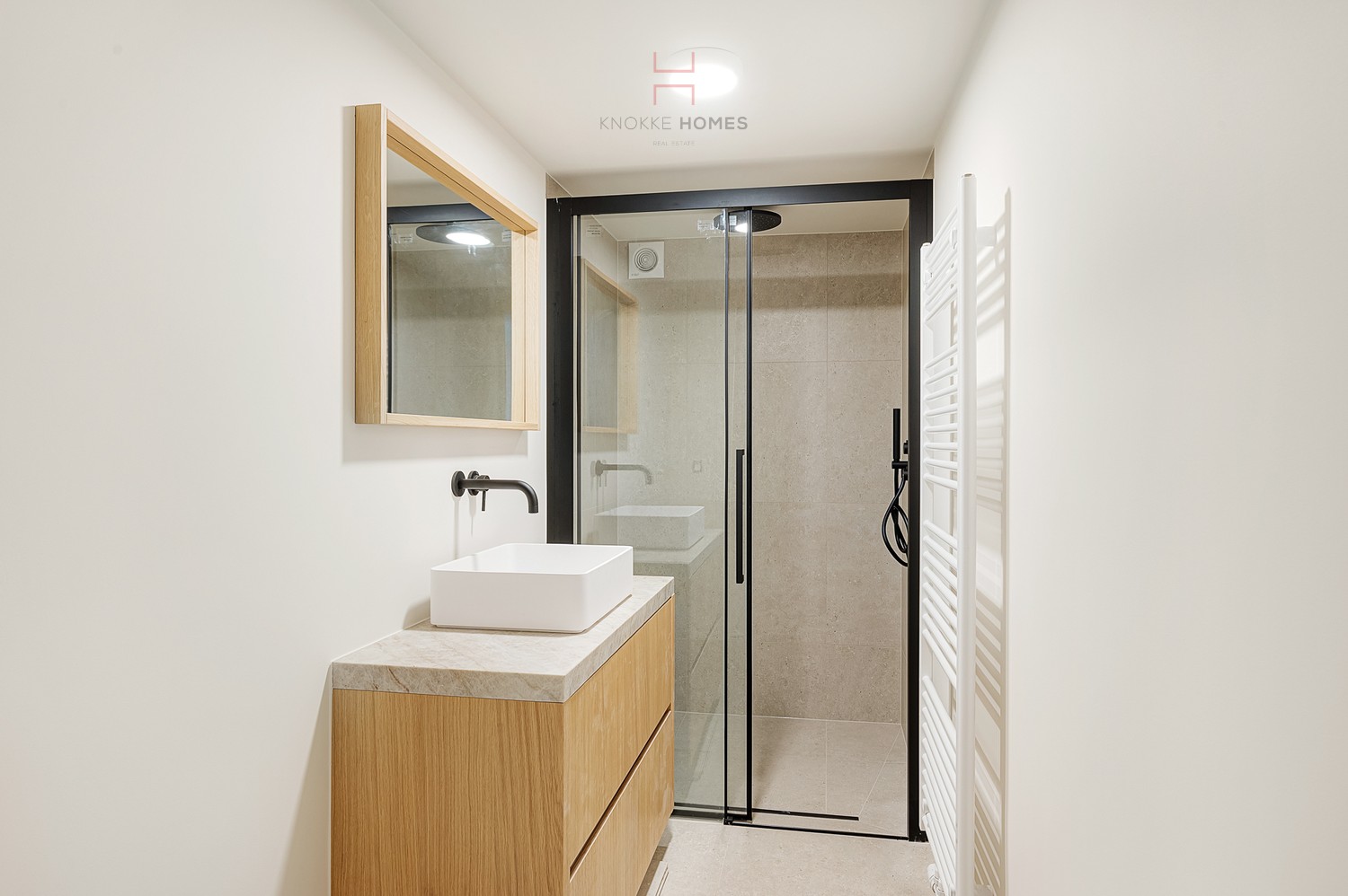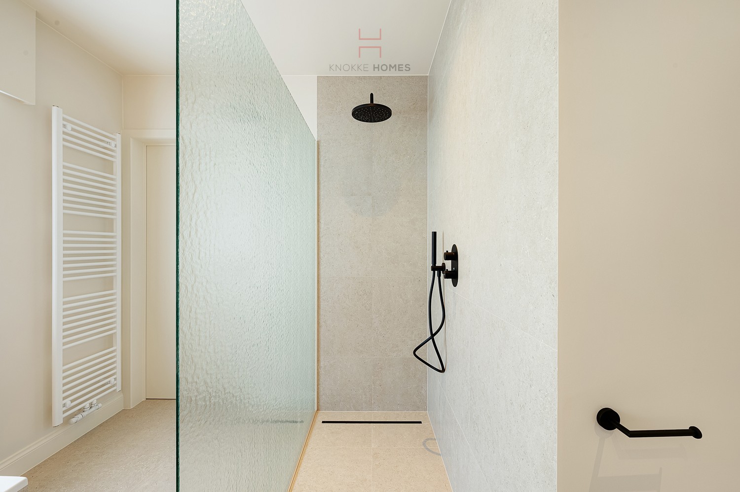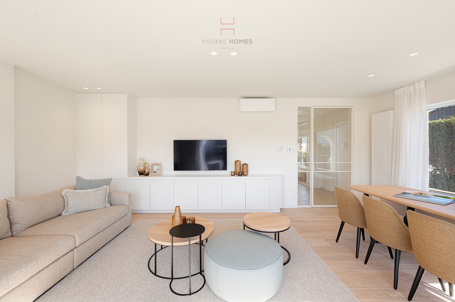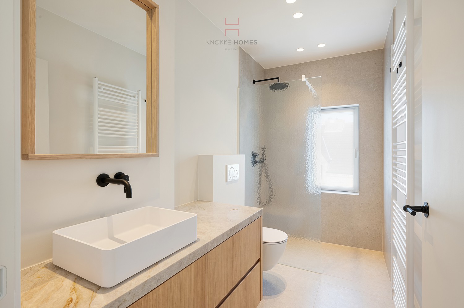 Via de stijlvolle inkomhal met gastentoilet betreedt men de gezellige lichtrijke leefruimte aan de voorzijde en de open keuken aan de tuinzijde. De zonnige woonkamer straalt warmte en elegantie uit en vormt het kloppend hart van de woning, terwijl de luxueuze keuken, afgewerkt in eiken fineer, een echte eyecatcher is. Deze is volledig uitgerust met kwalitatieve toestellen, en sluit naadloos aan op een gezellige eethoek met prachtig zicht op de tuin en het aangename terras.