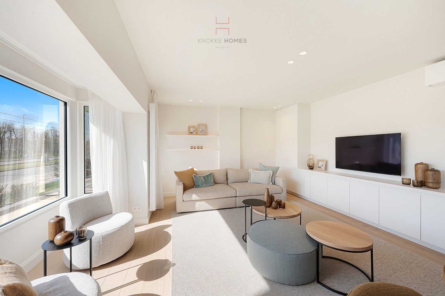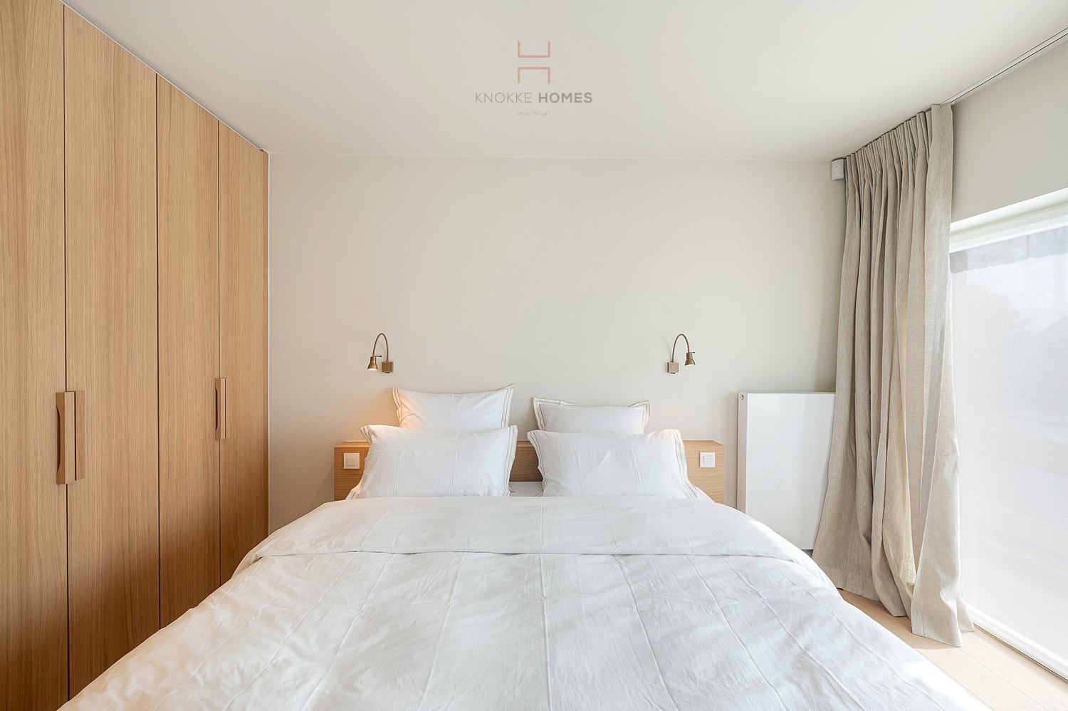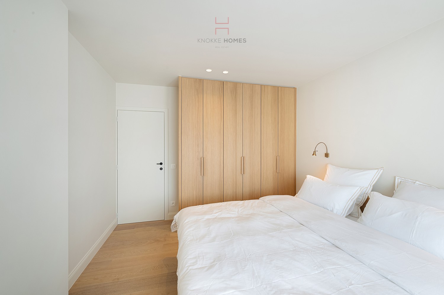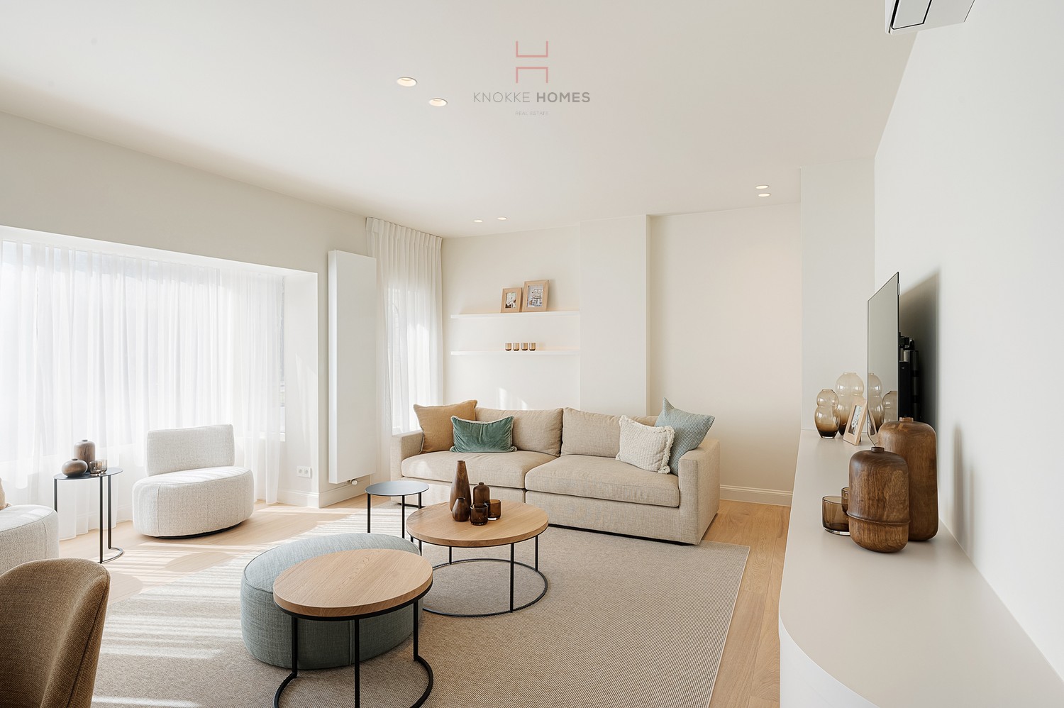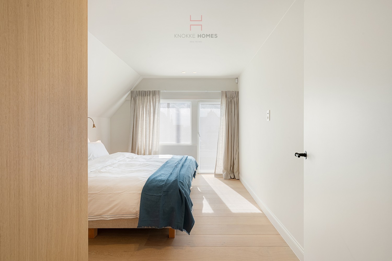 Via de stijlvolle inkomhal met gastentoilet betreedt men de gezellige lichtrijke leefruimte aan de voorzijde en de open keuken aan de tuinzijde. De zonnige woonkamer straalt warmte en elegantie uit en vormt het kloppend hart van de woning, terwijl de luxueuze keuken, afgewerkt in eiken fineer, een echte eyecatcher is. Deze is volledig uitgerust met kwalitatieve toestellen, en sluit naadloos aan op een gezellige eethoek met prachtig zicht op de tuin en het aangename terras.