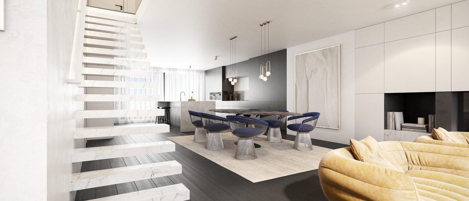 LAATSTE APPARTEMENT in Project Mercator: realisatie van 8 appartementen van ca. 140 m2 grote 3 slaapkamer-appartementen, één exclusieve mezzanine op verdieping 9 en 9+ van ca. 242 m2 en een 210 m2 royale penthouse-duplex. Onderin is voor elk appartement een bijzonder grote private berging en een grote gemeenschappelijke fietsenberging via fietslift (nieuw!)