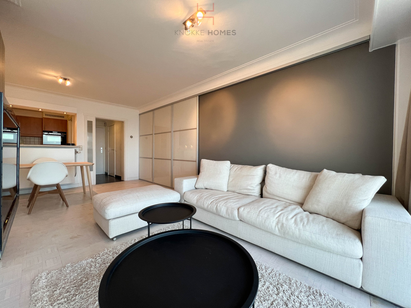 Mooie studio op de zeedijk in Duinbergen bij de RBSC zeilclub met een mooie woonkamer met terras en zeezicht, open en ingerichte keuken, doucheruimte met toilet. Op niveau -1 is er een private kelder en op de binnenkoer een bergplaats voor fietsen.