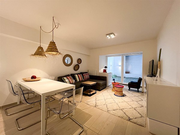 Gerenoveerd appartement met groot terras en 2 slaapkamers te Duinbergen. Mogelijkheid tot het bijhuren van een strandcabine en garage met fietsenberging onder het Stübbenpark.