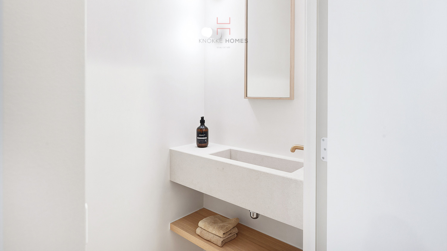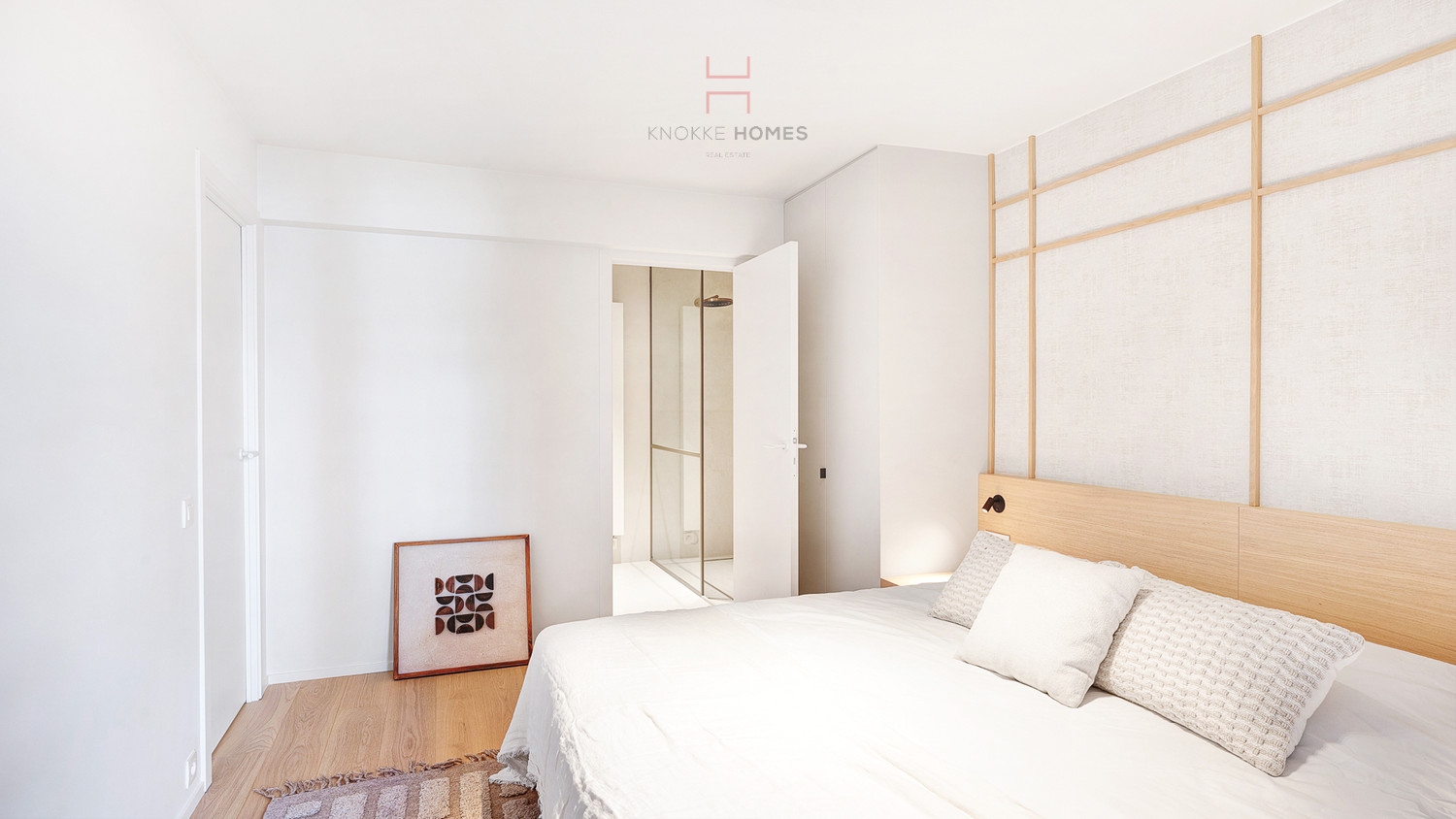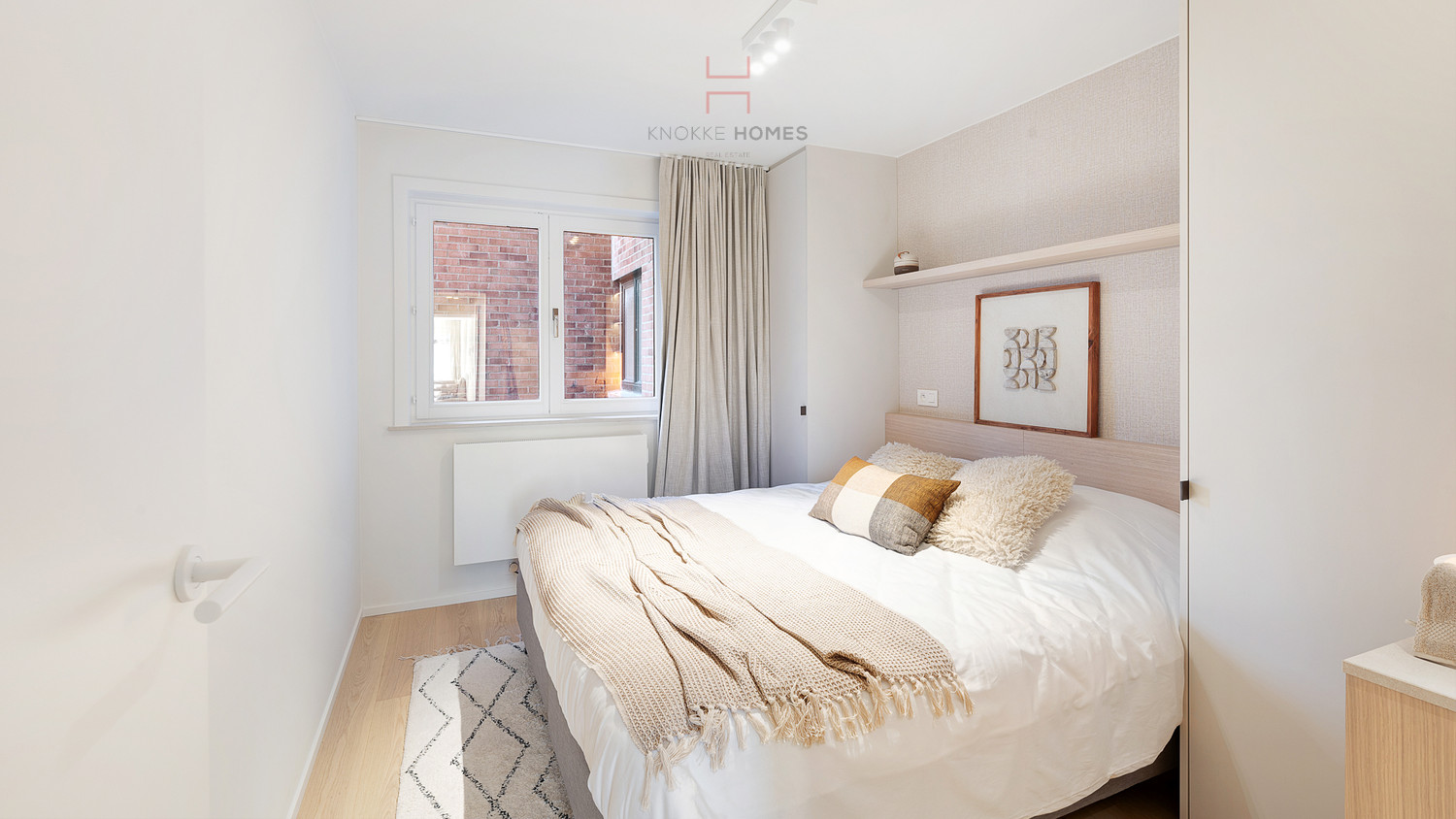 Het appartement omvat twee ruime slaapkamers, elk voorzien van maatkasten en privatief sanitair. De master bedroom beschikt over een stijlvolle douchekamer met inloopdouche, lavabo en toilet. De tweede slaapkamer heeft eveneens een eigen douche en lavabo, wat optimaal comfort en privacy garandeert.