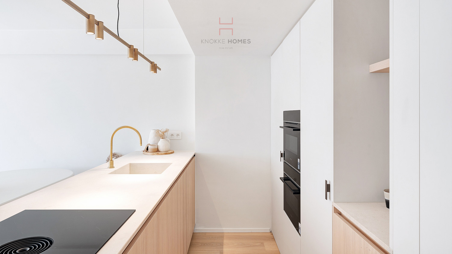 De lichtrijke leefruimte met elegante afwerking sluit naadloos aan op het zonnige terras, waar het aangenaam vertoeven is. De open, volledig ingerichte keuken werd praktisch geïntegreerd en beschikt over een aansluitende berging.